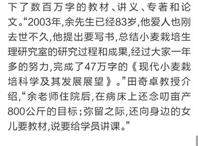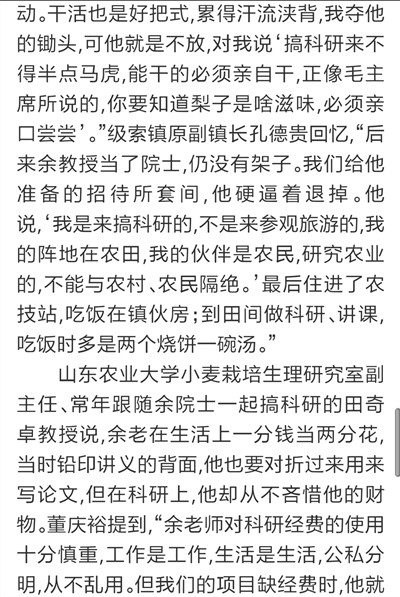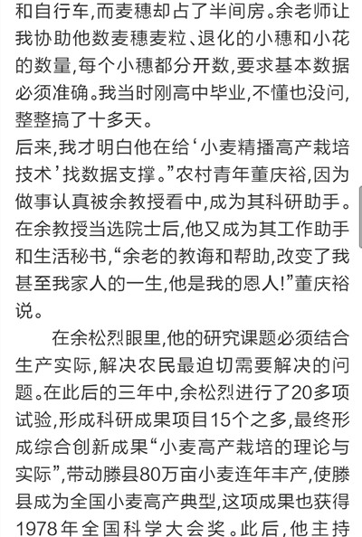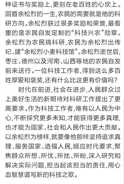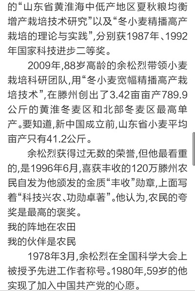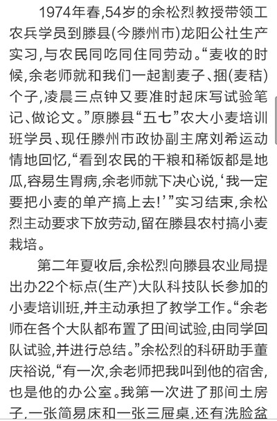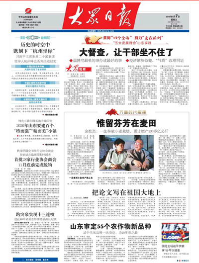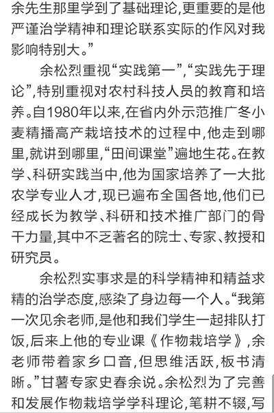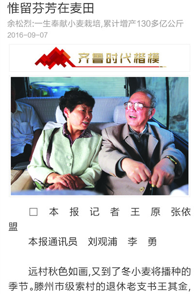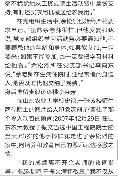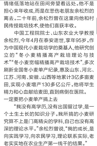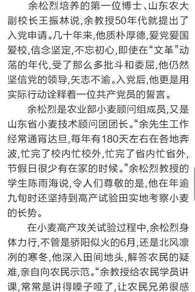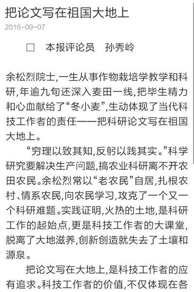 9月7日,《大众日报》刊发长篇通讯《唯余芬芳在麦田》,对我校已故中国工程院院士余松烈同志先进事迹进行报道。报纸同时配发评论员文章《把论文写在祖国大地上》,称赞余松烈院士生动体现了当代科技工作者的责任,赢得了百姓的厚爱和褒奖,号召广大科技工作者以余松烈为榜样,用心血智慧谱写新的科技之歌。