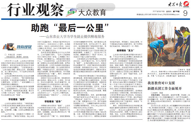 3月16日,大众日报刊发了新闻通讯《助跑“最后一公里”——山东农业大学为学生就业提供精准服务》,从学校精准指挥、学院精准疏导、教师精准发力三个层面,介绍了学校就业工作。(点击阅读全文)