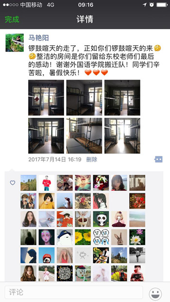 7月14日下午,外国语学院辅导员马艳阳微信朋友圈里的一条信息让很多人点赞,她写道,你们锣鼓喧天的走了,正如你们锣鼓喧天的来,整洁的房间是你们留给东校老师们最后的感动!