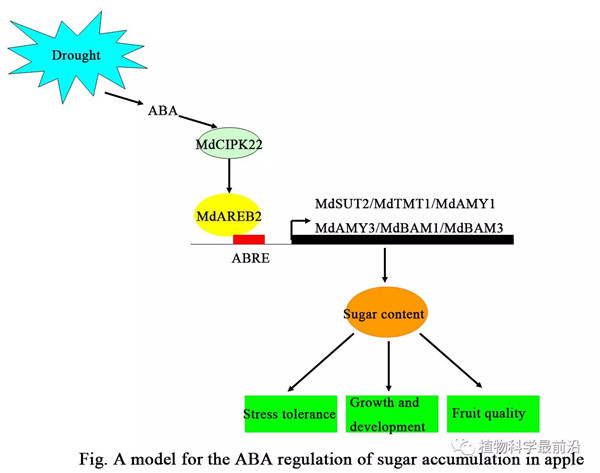 在果树和其它果实作物的生产中,适度的干旱胁迫或ABA处理能够促进果实中的糖积累,从而提高果实的风味品质,但其分子机制不清楚。郝玉金团队长期从事苹果果实品质形成与调控研究,在该研究中,首先确定了苹果中淀粉酶和液泡膜蔗糖转运蛋白MdSUT2在ABA诱导的可溶性糖积累中具有重要作用,而MdAREB2是苹果应答ABA和干旱信号、激活MdSUT2等基因表达的关键转录因子,过量表达MdAREB2基因增加了转基因苹果植株的ABA敏感性,MdAREB2-MdSUT2是ABA诱导果实糖积累的关键转录单元。进一步研究发现,蛋白激酶MdCIPK22与MdAREB2蛋白相互作用,在ABA处理(或干旱)条件下将MdAREB2蛋白的Thr411残基磷酸化,提高MdAREB2蛋白的稳定性和转录活性。这些研究结果表明,ABA或干旱诱导的蛋白激酶MdCIPK22能够磷酸化转录因子MdAREB2,使其高效地激活淀粉酶和糖转运蛋白基因的表达,最终促进可溶性糖积累,提高植物的抗逆性和果实品质。