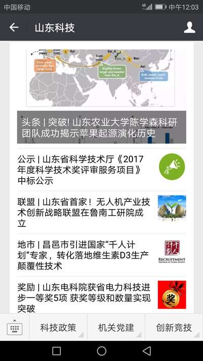 8月15日晚,山东省科技厅官方微信“山东科技”以《头条|突破!山东农业大学陈学森科研团队成功揭示苹果起源演化历史》为题,对新闻进行了主题推送。文章说,近年来,陈学森带领研究团队围绕新疆野苹果资源的保护、发掘、创新与利用开展攻关,以“高类黄酮苹果育种”为核心,构建了新疆红肉苹果与苹果品种杂种一代、二代分离群体,明确了新疆野苹果遗传多样性特征及性状遗传变异特点,提出了苹果类黄酮生物合成的转录调控网络,创建了“果树多种源品质育种法”“易着色苹果品种培育法”及“三选两早一促的苹果育种法”等优质高效育种技术体系,创制了一批新品种及优异种质,建立了新品种配套高效生产技术体系。目前,已授权和申报发明专利52项,育成并审定苹果优质红色芽变新品种8个及高类黄酮苹果新品系10个。