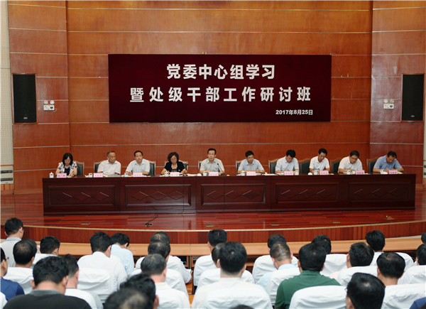 8月25日,学校举办党委中心组学习暨暑期处级干部工作研讨班。党委书记徐剑波作了题为《学校发展正面临前所未有的机遇和挑战》的讲话,要求全校教职员工凝心聚力,进一步明确工作机遇与挑战,以干事创业的新的更大成绩迎接党的十九大胜利召开。校长张宪省总结学校上半年工作,部署下半年重点任务,要求各单位、各部门切实抓好工作落实。