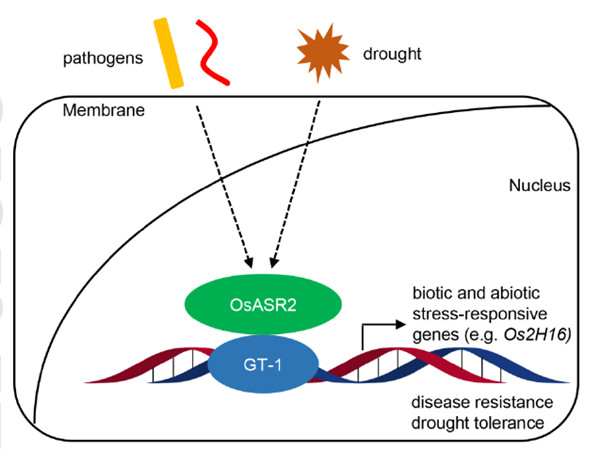 针对这一情况,储昭辉科研团队对前期鉴定的编码水稻抗病及抗旱多功能短肽基因Os2H16的启动子进行了系统的分析,鉴定了该启动子区域内的GT-1顺式作用元件在响应多种病原侵染及干旱胁迫过程中发挥重要作用;通过酵母单杂交、EMSA、ChIP-seq等实验筛选并验证了与GT-1互作的转录因子OsASR2(abscisic acid, stress and ripening 2),并发现该转录因子在水稻中正向调控水稻对白叶枯病、纹枯病及干旱的抗性。从而阐明了转录因子OsASR2介导的抗病及抗旱的保守调控机制,为功能短肽的转录调控提供了新的认知,更为作物多重抗逆精准遗传改良提供了新的基因资源和调控元件。