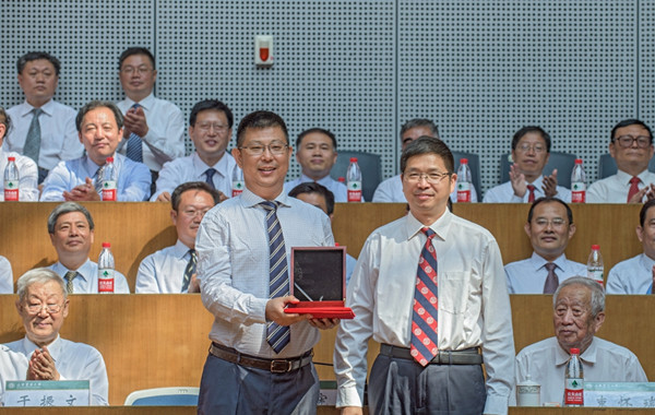 校长张宪省为山东农业大学第六届杰出校友颁奖。1991级植物保护专业校友、山东万豪集团董事长丁绍武获杰出校友称号。