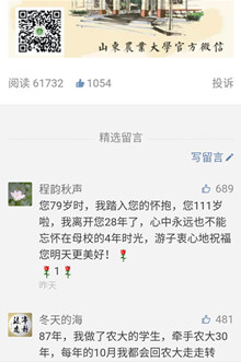 网友张建涛说,毕业十余载,母校始终是我的骄傲。登高必自的校训始终是我的坚守。老师的敦敦教导如在耳旁,同学的深深情意如在身边,走遍天涯海角,踏过五湖四海,这份情怀始终如一,我爱你山农大,祝你生日快乐!