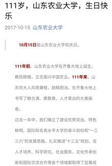 10月15日是山东农业大学校庆日,学校官方微信(微信号:sdauxcb)以“111岁,山东农业大学,生日快乐”为题进行了主题推送。文中说,111年前,山东农业大学在齐鲁大地上诞生,教民稼穑,立志振兴中国农业。111年来,山东农大人风雨兼程,励精图治,在齐鲁大地上书写了粮仓满、果飘香、人才辈出的大美画卷。过去一年中,学校确立了建设优势突出、特色鲜明、国际知名高水平大学的奋斗目标和“一三三六”的发展思路,扎实推进“十三五”规划,在人才培养、科学研究、社会服务、文化传承创新和国际交流合作等各个领域都取得了显著成绩。