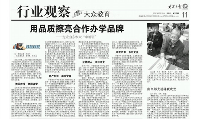 1026,《大众日报》以“用品质擦亮合作办学品牌”为题,详细报道了山东农业大学十五年来始终坚持以提升品质为核心,多措并举、持之以恒、久久为功,打造了“中德班”靓丽品牌的经验做法。文章占据了近三分之一个版面,分为德国教授、德国课堂;宽严相济、服务管理;立德树人、又红又专;激发活力、多方受益等四个部分,全方位展现了我校中外合作办学的教学体系、管理模式和发展前景。