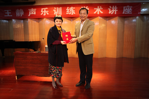 在校期间,王静教授为体艺学院师生作了题为《声乐训练与作品演唱分析》的学术报告,结合艺术经历对如何开展声乐训练、如何结合舞台实践把作品吃透、如何找准自己的强项以及用强项去填补弱项等,进行了精彩的阐释。她还为学生演唱进行了现场指导,从气息、感情等方面进行了点评,并以自己的发声示范纠正了学生在歌唱中存在的问题。王静教授认真细致的教学态度和精湛高超的演绎水平获得了现场观众的热烈掌声。