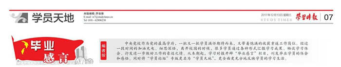 近日,《学习时报》刊发了中央党校中青一班学员、学校党委书记徐剑波撰写的《担负起育人的历史责任》一文。文章以习近平总书记教育思想为指引,详细阐释了新时代高等学校如何回答好“为谁培养人、培养什么样的人、怎样培养人”的问题。其中既有对党的十九大精神的学习体会,又有对高等教育发展的深刻思考,理论性和思想性并重,对学校进一步落实立德树人根本任务、培养担当民族复兴大任的时代新人具有很强的指导意义。