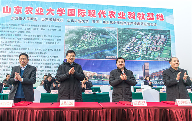 1月19日,山东农业大学、山东省黄河三角洲农业高新技术产业示范区管委会、东营市人民政府、山东省科技厅在东营签署共建山东农业大学国际现代农业科教基地合作协议。山东农业大学吹响了进军黄河三角洲的号角。