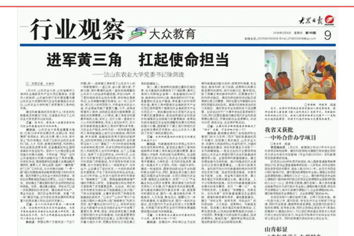 2月8日,《大众日报》用接近二分之一个版面,以《进军黄三角 扛起使命担当》为题,刊发了对山东农业大学党委书记徐剑波的专访。专访以学校在黄三角建立国际现代农业科教基地为切入点,回顾学校在黄三角开展科技服务和人才培养的历史足迹,展现基地建设发展的远景蓝图,为山东农大人主动对接国家重大发展战略,扎根中国大地、齐鲁大地办大学的家国情怀和历史担当点赞。