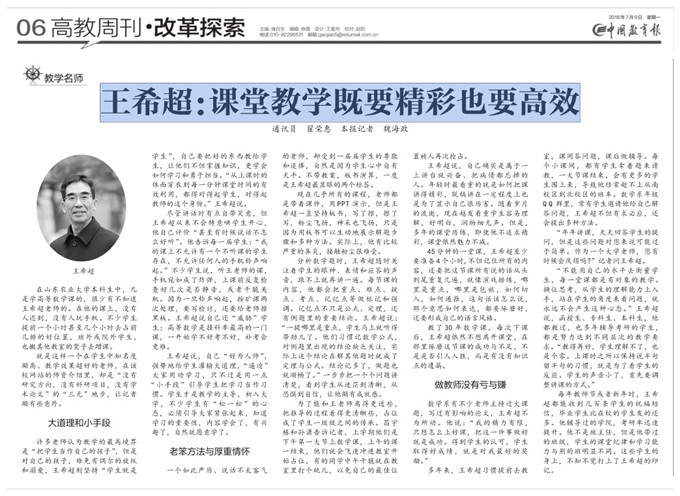 7月9日,中国教育报在“教学名师”栏目刊发题为《王希超:课堂教学要精彩也要高效》的人物通讯,称赞我校信息学院高等数学课教师王希超专注教书育人,不仅精于课堂教学,更在教学中铸造出优良师德师风,赢得学生爱戴。