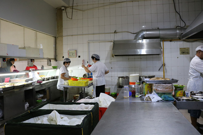 暑假期间,为了保障留校学生用餐,三个校区分别开放了部分就餐窗口提供学生健康、可口饭菜。饮食服务中心工作人员每天进行原材料查验、严格遵守加工操作规范,保障了学生饮食安全。中午12:00,餐厅工作人员忙着在给学生打饭。
