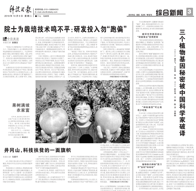 10月9日,科技日报刊发题为《三个植物基因秘密被中国科学家破译》文章,报道国内植物基因研究领域最新科研成果。我校园艺学院胡大刚团队科研成果位列其中。
