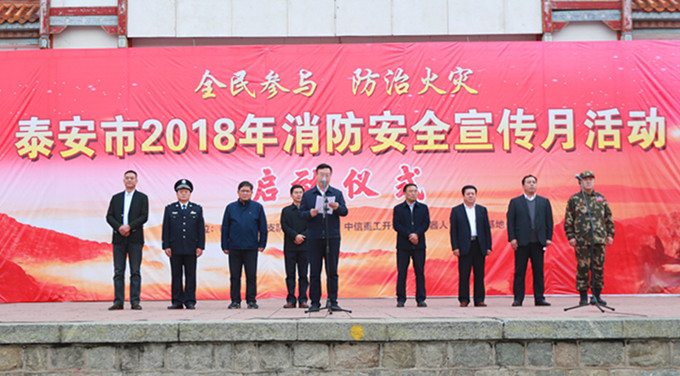 11月7日,“全民参与、防止火灾”泰安市2018年消防安全宣传月活动启动仪式在我校东校区操场举办。市委副书记、东平县委书记张涛,市人大常委会副主任曹步山,市政府副市长赵德健,市政协副主席马纯勇,山东农业大学副校长吴衍涛,市打私办专职副主任彭恒玖,市公安局党委委员、副政委刘岱英,市消防支队支队长巩向海,中信重工开诚特种机器人(东平)基地董事长刘建忠等出席活动。