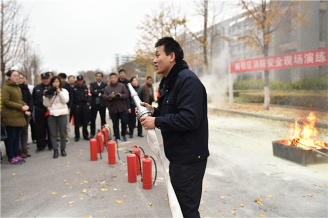 讲座结束后,南校区安保部有关负责同志向大家现场示范了灭火器和消防栓的使用方法,并组织大家进行了实战演练。