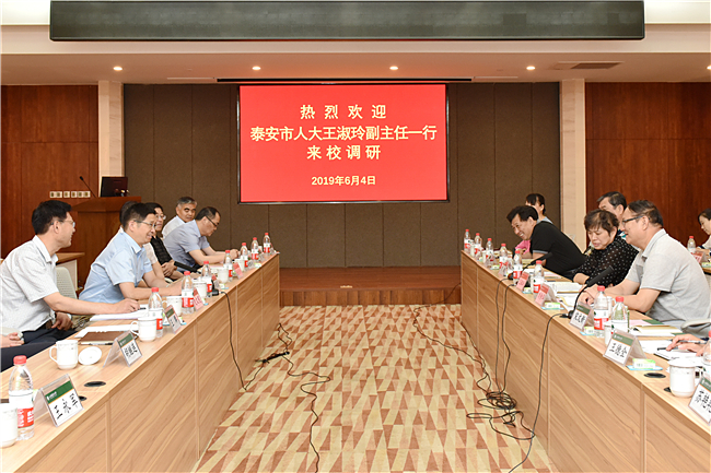 6月4日,泰安市人大常委会副主任、市工商联主席王淑玲带领市人大科教文卫委员会、部分驻泰全国人大代表、泰安市人大代表和市直有关部门来校调研。校长张宪省会见客人并座谈交流,围绕进一步推进校地合作开展深入探讨交流。副校长嵇景涛参加调研。