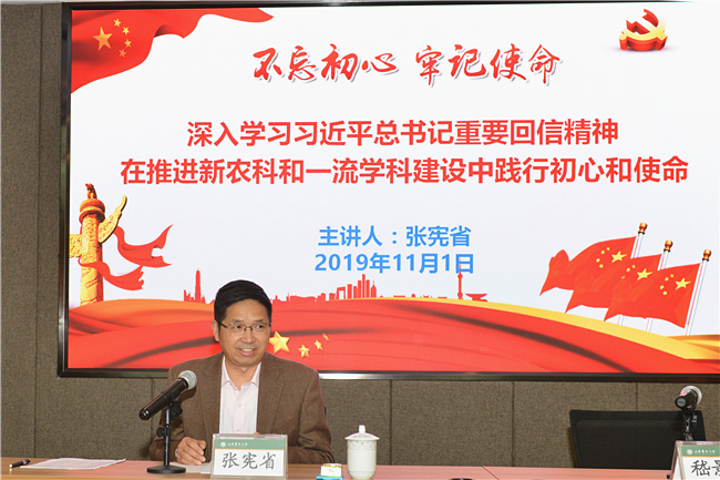 11月1日下午,按照学校“不忘初心、牢记使命”专题党课的总体安排,校长张宪省在国重楼学术报告厅,围绕深入学习贯彻习近平总书记重要回信精神,在推进新农科和一流学科建设中践行初心和使命,讲授主题教育专题党课。副校长嵇景涛主持党课。