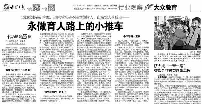 1月16日,《大众日报》刊发通讯,报道我校退休教授李继业先进事迹,称赞他16载抗击癌症病魔,笔耕不辍立德树人,成为思想政治工作的“常青树”。