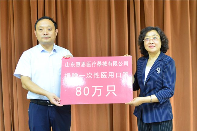 7月15日,学校举行抗疫物资捐赠仪式,山东惠恩医疗器械有限公司向我校捐赠80万只一次性医用外科口罩,助力学校新冠肺炎疫情防控工作。党委副书记朱莉代表学校接受捐赠,感谢爱心企业对农大办学发展的大力支持。