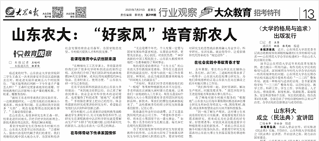 在全国上下深入学习贯彻习近平总书记对研究生教育重要批示精神之际,《大众日报》刊发题为《山东农大:“好家风”培养新农人》通讯报道,点赞我校紧密对接国家重大战略,创新高层次人才培养模式,为党育人、为国育才的典型做法。